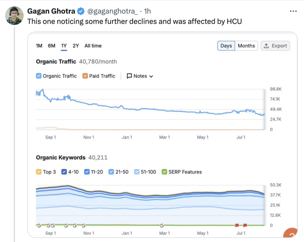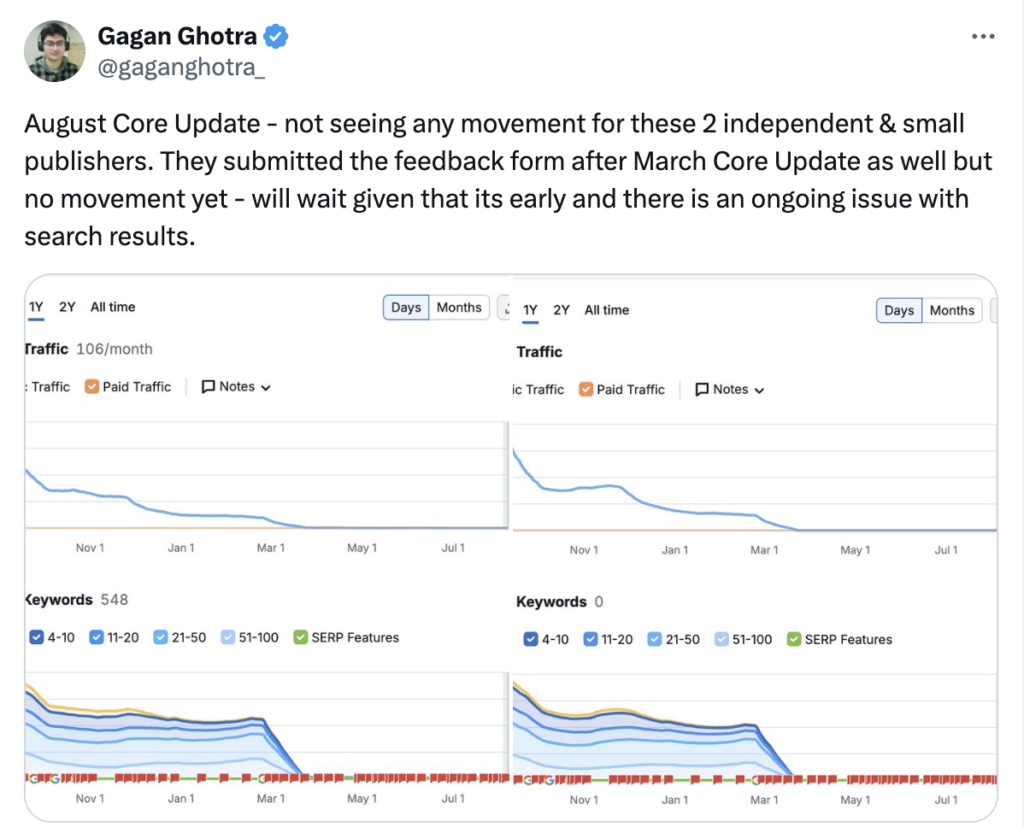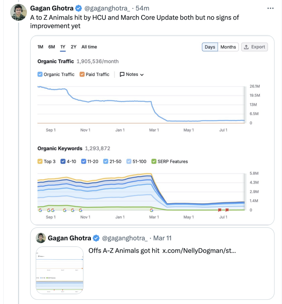 Also Glenn has been reporting about ranking movement of sites affected by September Helpful Content from last year. Which has been super useful for the whole SEO Community to keep a track of if sites affected by HCU were seeing some ranking improvement or no.