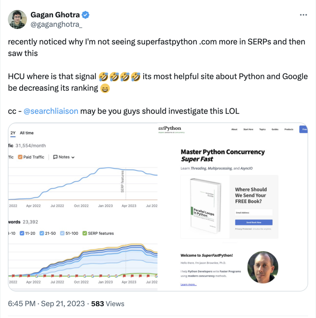 Super Fast Python – Python Programming Tutorials site run by Jason Brownlee and is now coming being it was hit by HCU back in Sep 2023 when Google rolled out HCU.