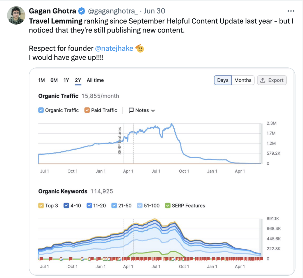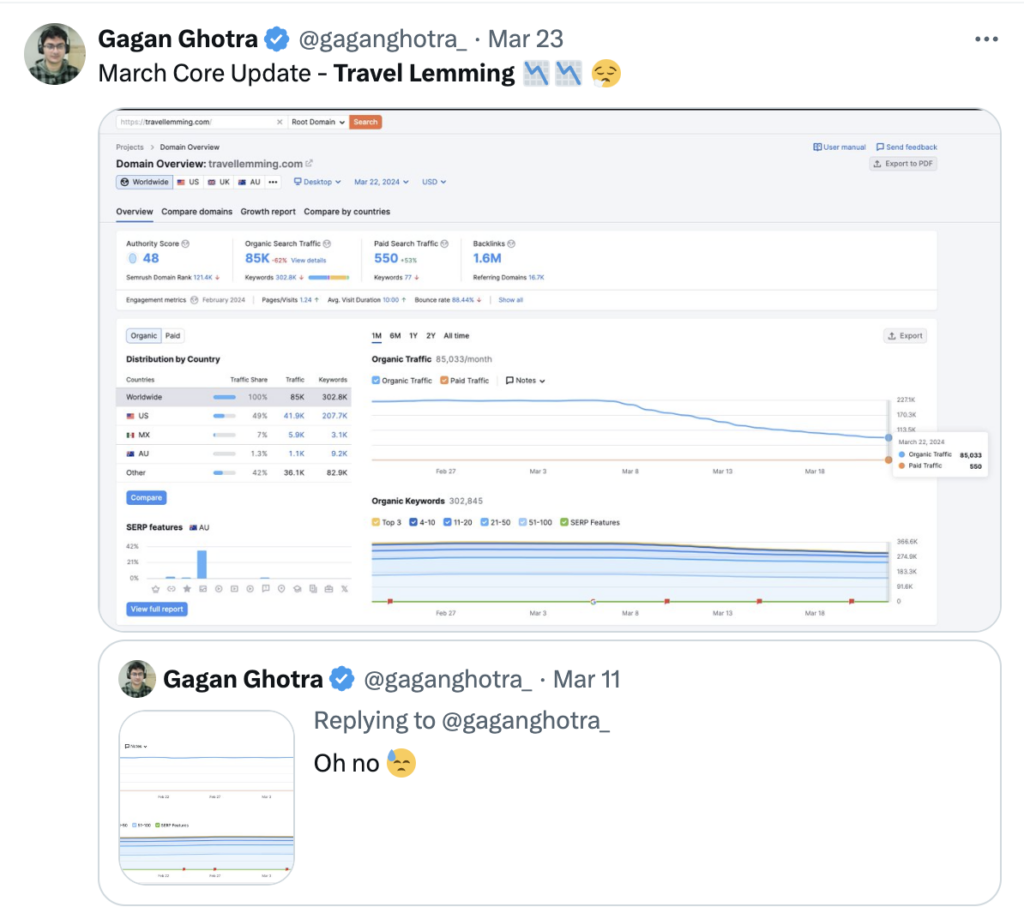 Another one is Travel Lemmings – as the name itself suggests this site publish content about travelling and was affected by HCU and then was impacted by recent March Core Update as well.
