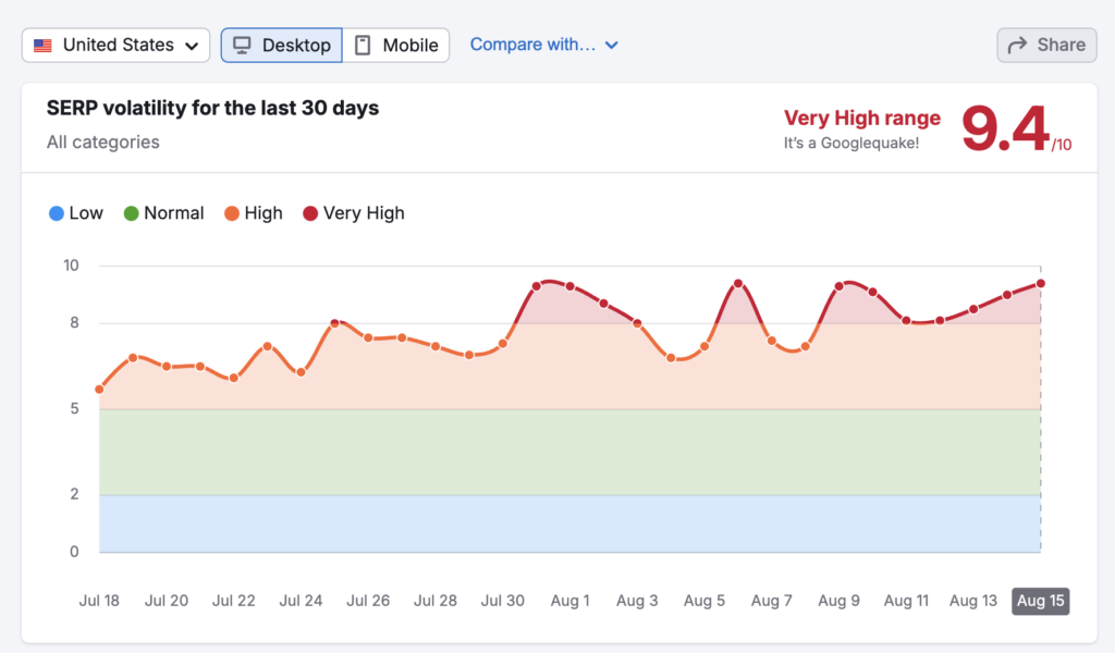 But with release of August 2024 Core Update Google I’m watching out to see if sites previously hit by September Helpful Content Update will recover or not. Google has said that this update will take around a month to roll out. But Semrush Sensor which tracks changes in Google’s Search Results is showing really high score which means that a lot of ranking changes are going on in the search results. So we might start to see SIGNIFICANT ranking improvement or decrease soon …..