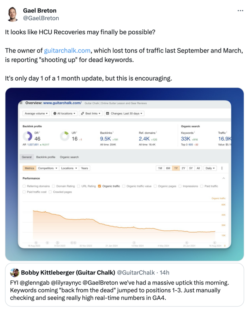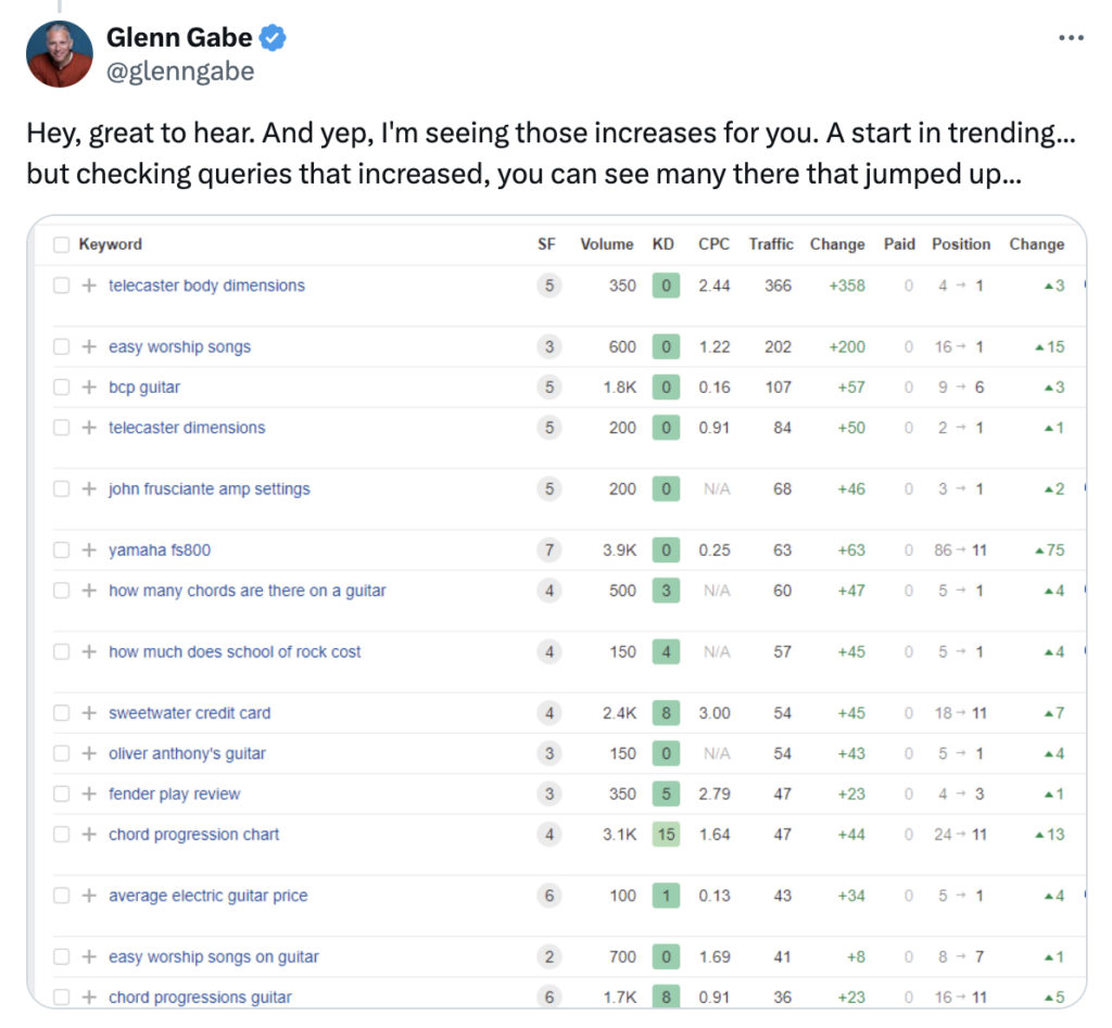 And SEO Professional Gael Breton (@GaelBreton on X) posted about Guitar Chalk which is a niche site talking about Guitars and now with the rollout of this August Core Update – this site is picking up in the ranking and improving.