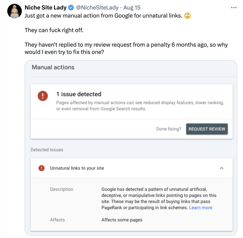 I noticed that a niche site owner got a Manual Action from Google which is suprising. But its not certain if its because of the August Core Update or not. I found this interesting that’s why adding it here.