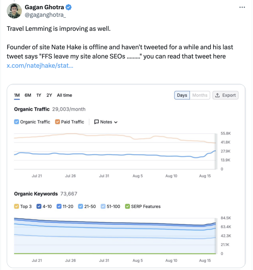 Another one is Travel Lemmings – as the name itself suggests this site publish content about travelling and was affected by HCU and then was impacted by recent March Core Update as well.