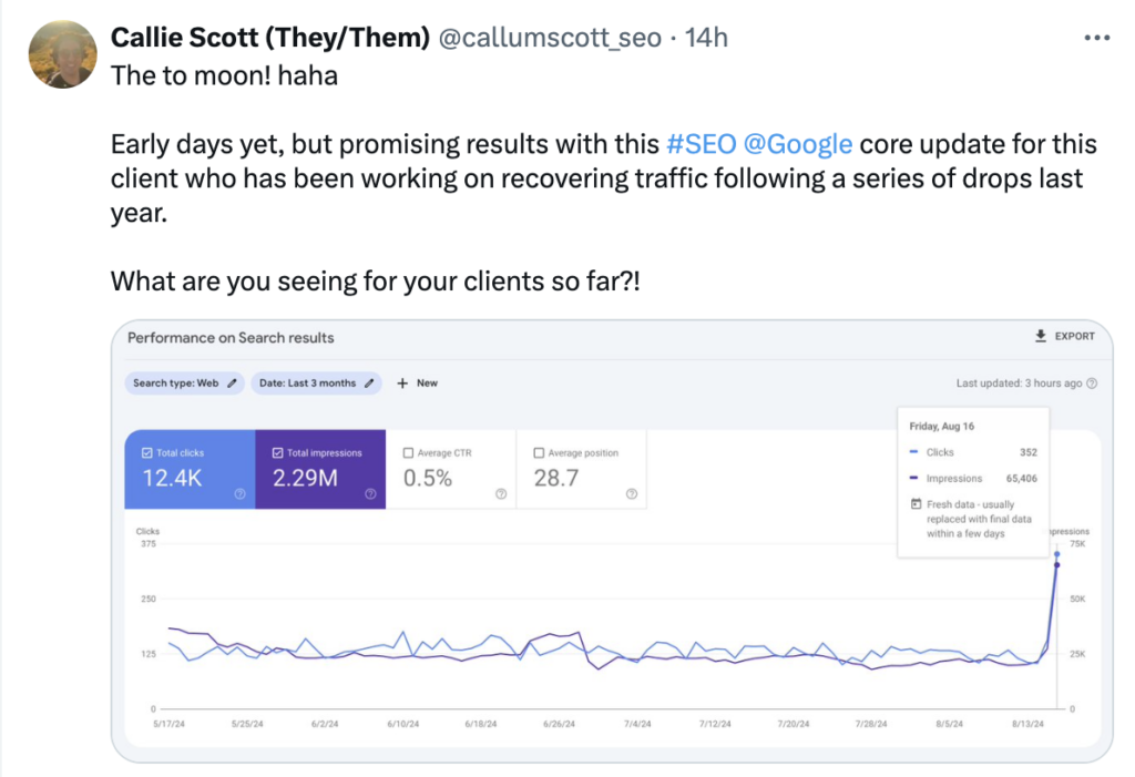 Also Callie Scott shared this screenshot of Google Search Console showing up tick in the clicks & impressions data in Google Search Console.