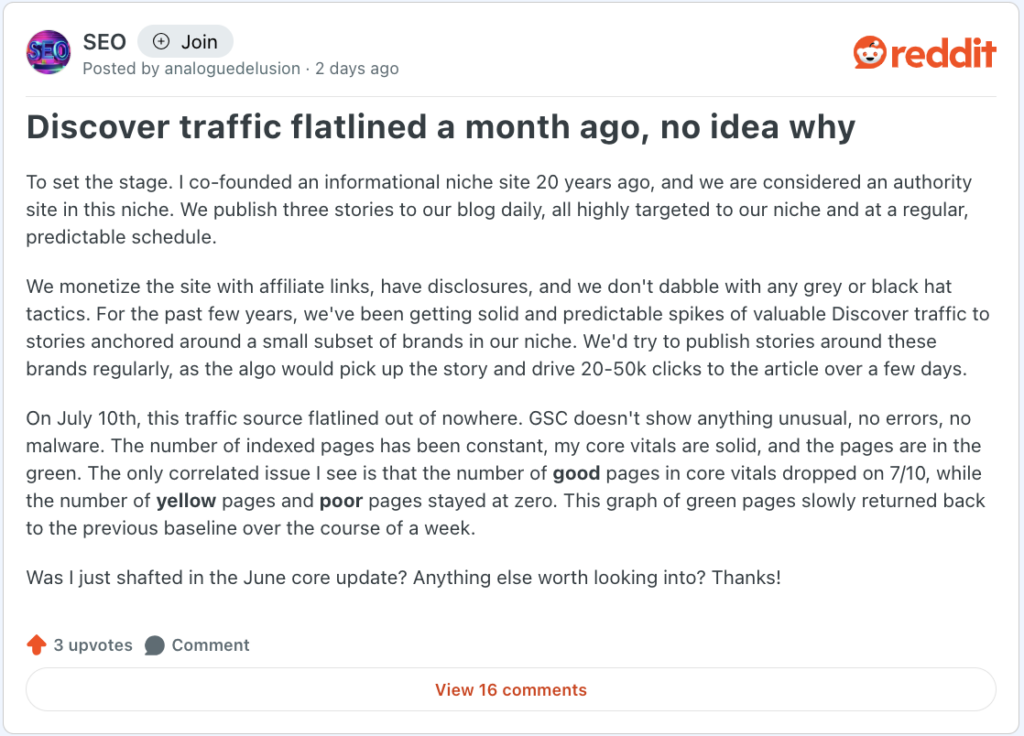 Noticed this Reddit post in r/SEO yesterday! Someone was talking about suddenly losing all the visibility in Google Discover.