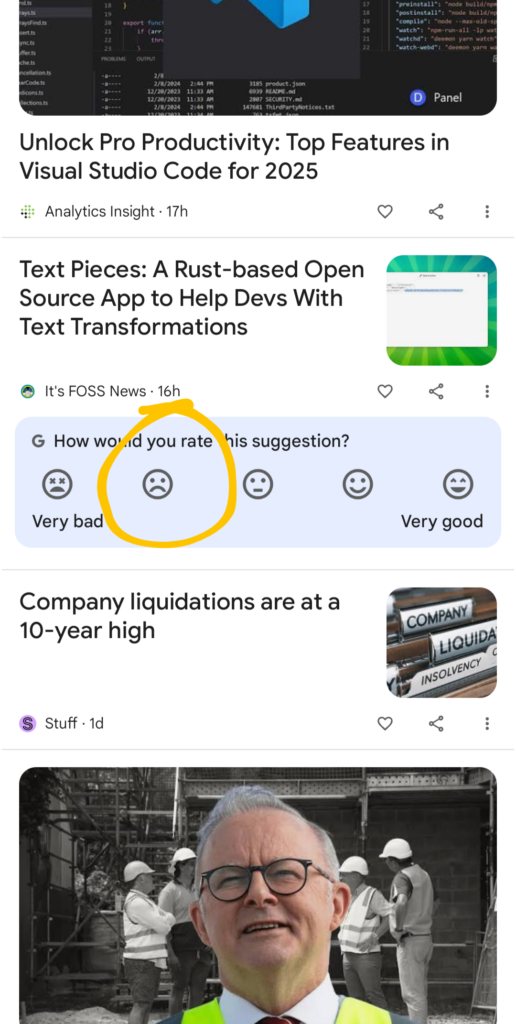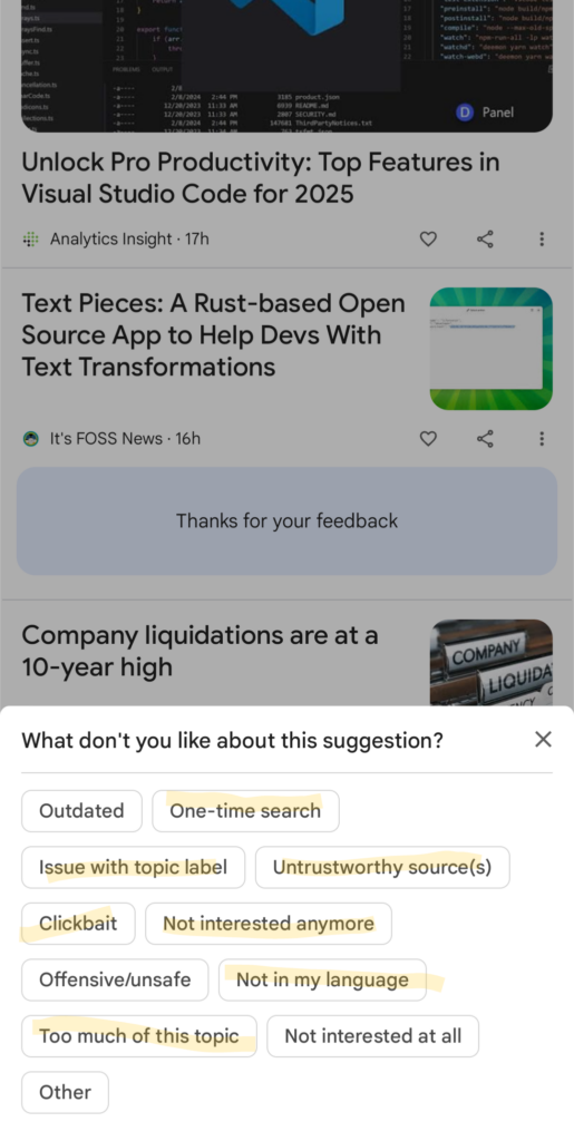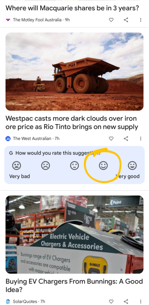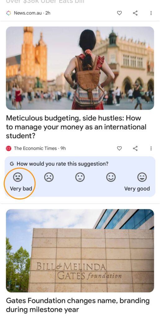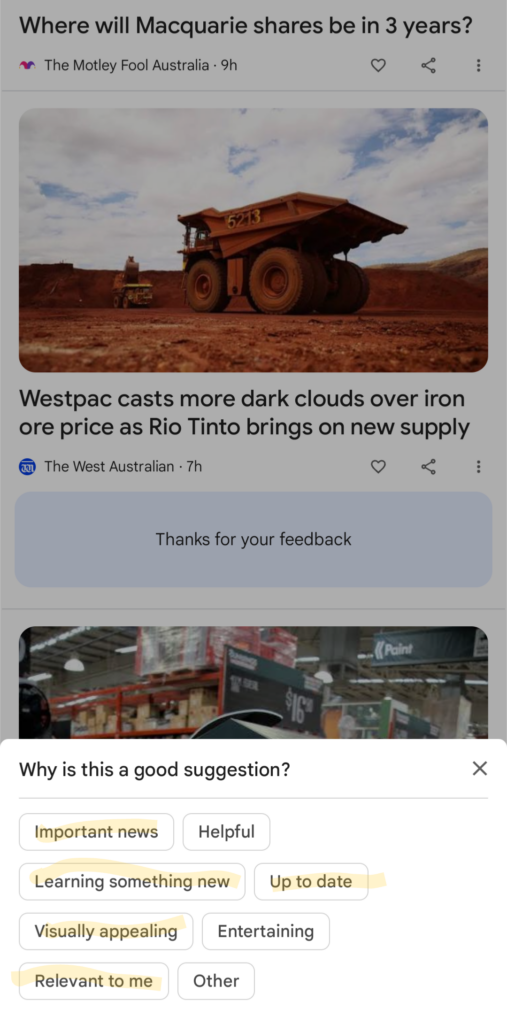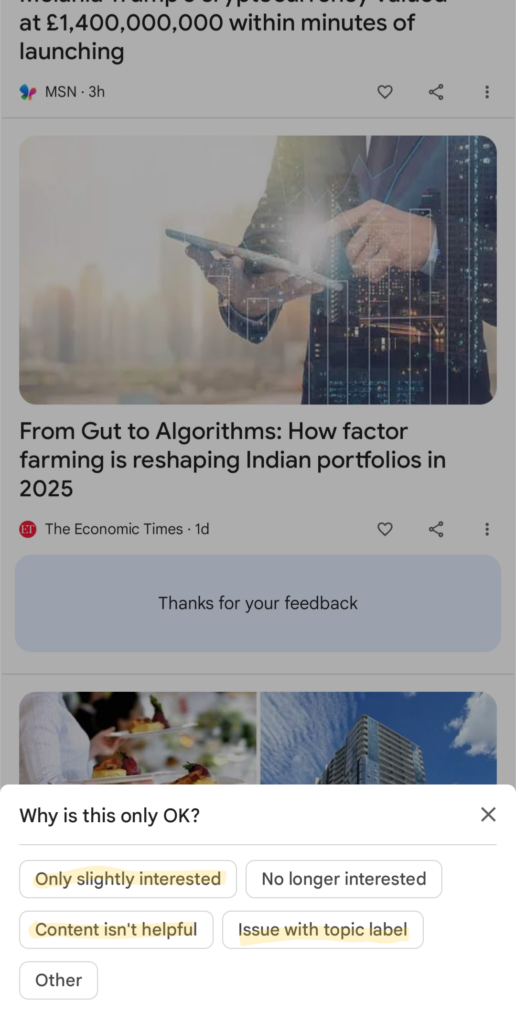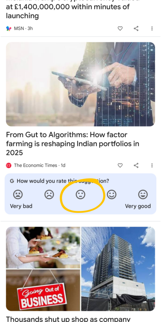 Sometimes below the cards in Google Discover feed, Google asks for feedback from users.