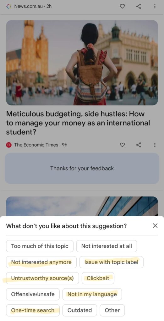 What I found interesting I think out of all these Untrustworthy source (s) is an interesting one because it kind of goes along what SEO industry has been talking recently – Build a brand which of course moves away any site from being a Untrustworthy source of information because people are able to recognise it and therefore might find it trustworthy over other sites whose name/favicon/design of site people can’t recognise. I found it interesting that Google specifically is seeking feedback around Untrustworthy source which also means that Google want to show more of trustworthy sources/sites in Google Discover feeds of users.