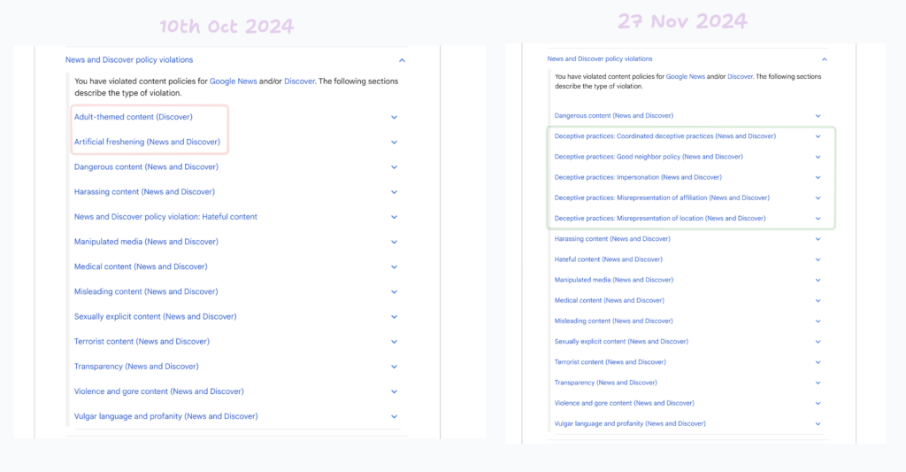 Important FYI last year somewhere between 10th Oct and 27 Nov Google updated Manual Actions for News and Discovers to add some specific policy violations for Deceptive Practices. I recently noticed this change and I’m not sure exactly between 10th Oct and 27 Nov when this change was done because in the history of Manual Actions page on Wayback Machine these two specific dates versions are available only.