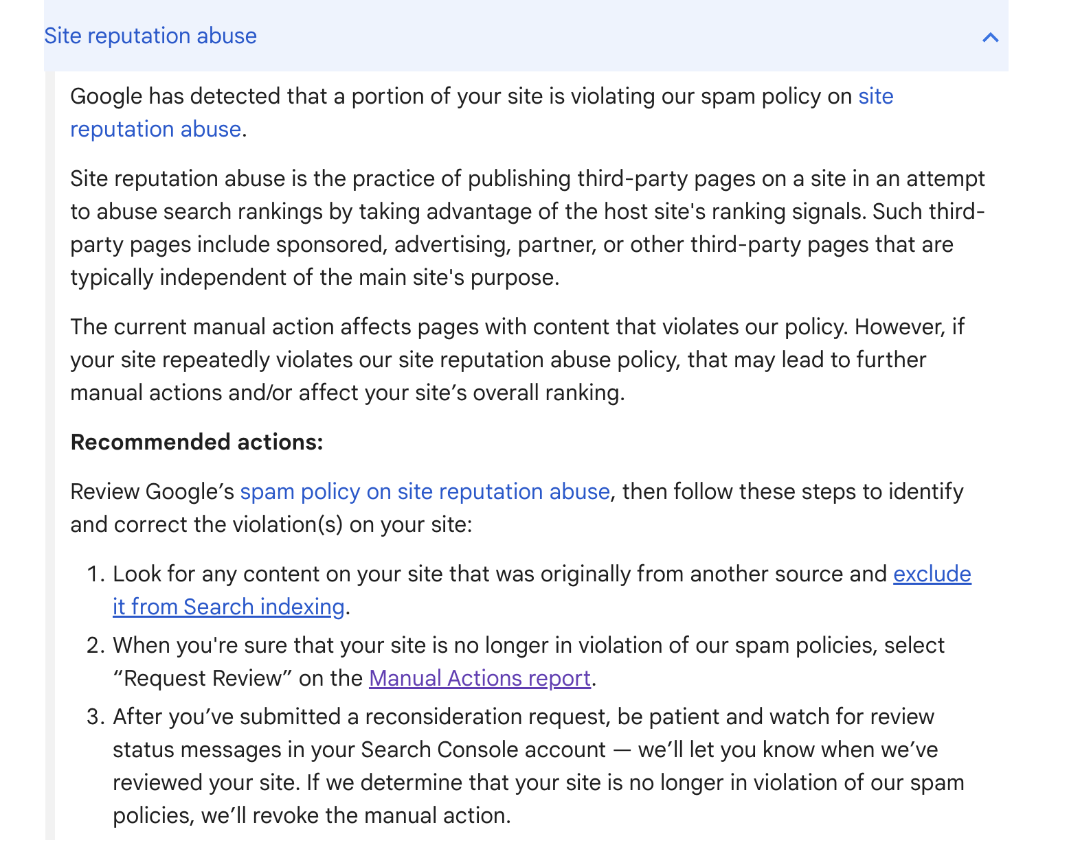 Site Reputation Abuse policy changes that lead to manual actions for publishers abusing their reputation requires publishers to provide sufficient evidence of change of editorial processes. And as Google has said in recent addition of FAQs to the policy – affected publishers have to noindex the policy abusing content and thereafter submit the request for lifting of manual action.