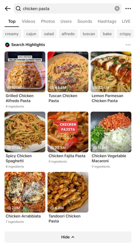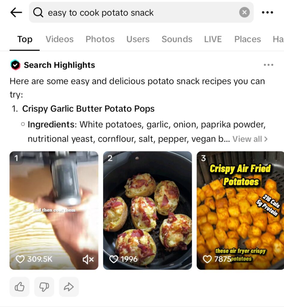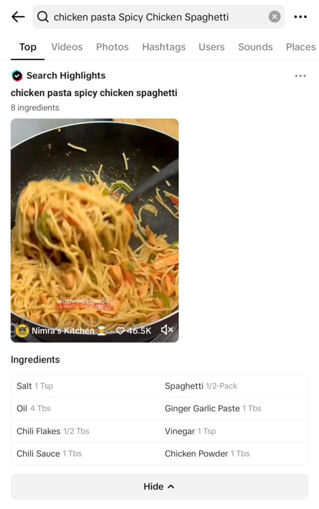 TikTok is now adding a lot of ‘recipe’ queries specific search features – showing ingredients in the answer, large recipe selector at top of results, in the videos adding specific cooking steps.