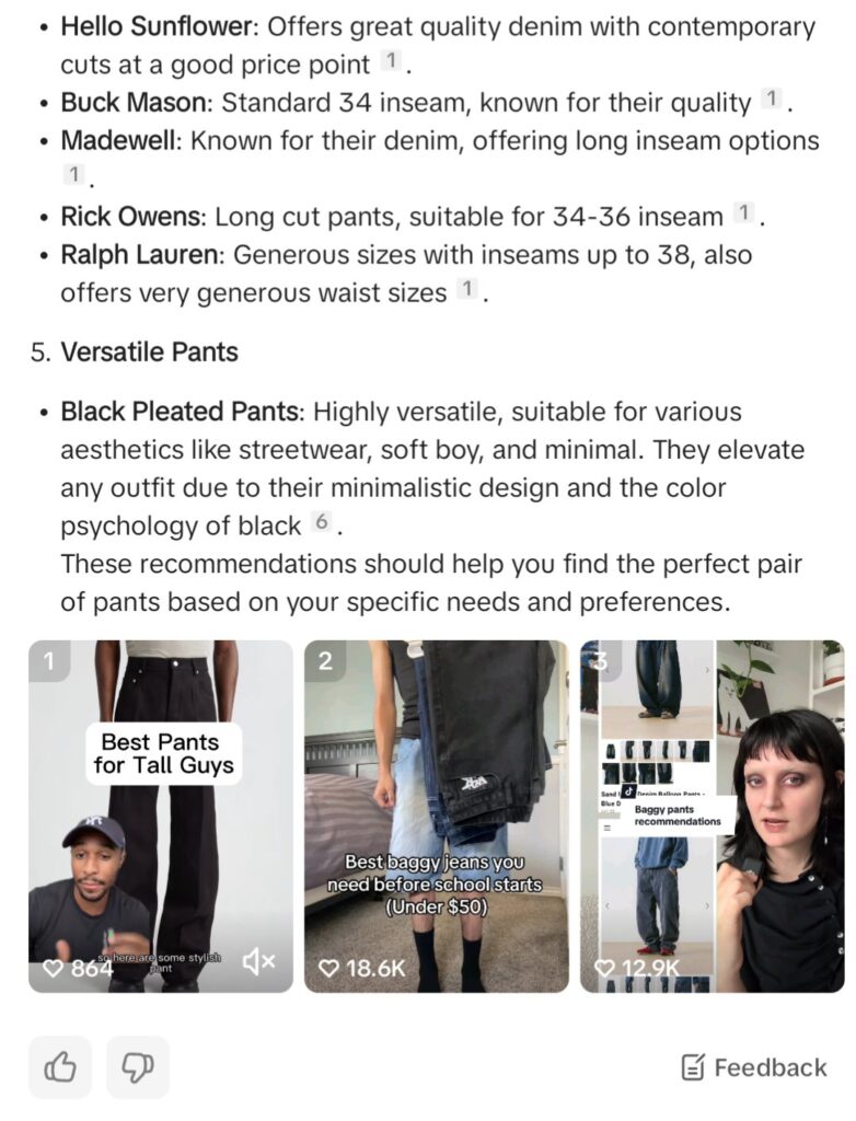 On 24th Jan I noticed that TikTok in their search results is showing video citations linked to the AI generated answer. Whenever is a search is done on TikTok app it shows “Search Highlights” at the top of results which is an answer generated using AI and now specific paragraphs in that answer have citation videos.