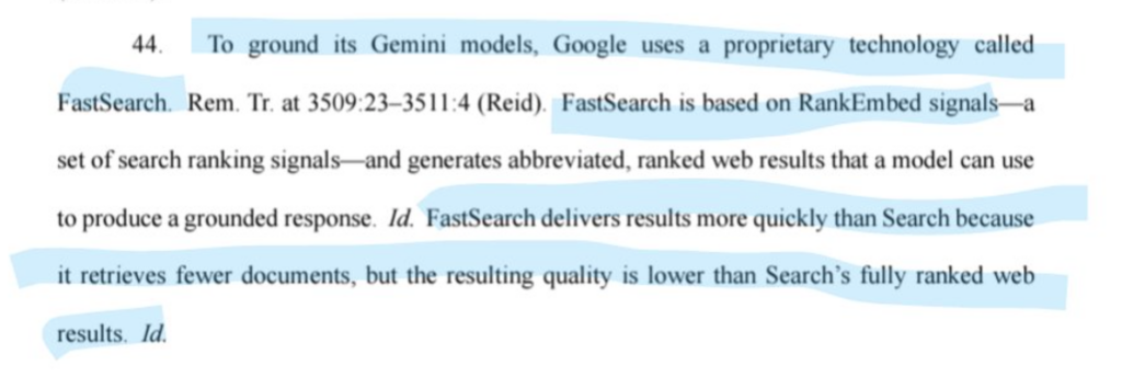 To ground its Gemini models, Google uses a proprietary technology called FastSearch. FastSearch is based on RankEmbed signals — a set of search ranking signals-and generates abbreviated, ranked web results that a model can use to produce a grounded response. FastSearch delivers results more quickly than Search because it retrieves fewer documents, but the resulting quality is lower than Search’s fully ranked web results.